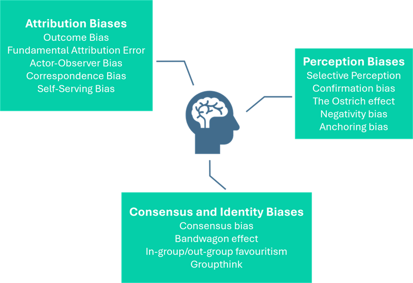 Ekrem categorizes biases for presentation clarity, beginning with attribution biases, where complex realities are simplified into internal or external reasons for success or failure. For example, "champions" or fans attribute positive outcomes internally (e.g., company innovation), while "jaded" individuals attribute success to external factors like luck. Conversely, failures are attributed internally by jaded individuals and externally by champions. This bias highlights how group affiliation shapes perception without necessarily dismissing any viewpoint outright.